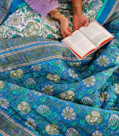 Blue Handblock Printed Pure Cotton Quilt Set – Handmade Artisan Bedding (4 Pieces)
