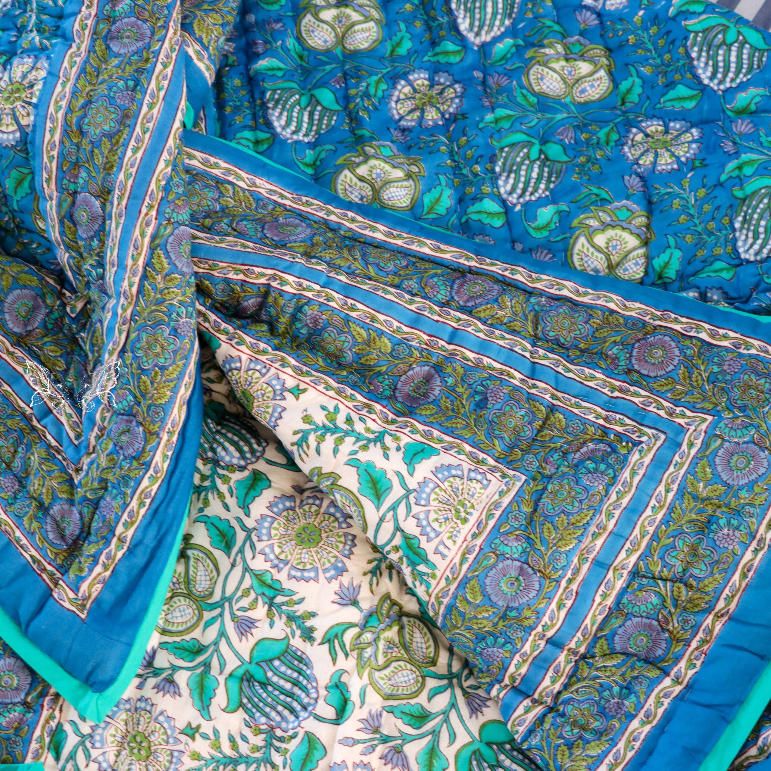 Green Handblock Printed Pure Cotton Quilt Set – Handmade Artisan Bedding (4 Pieces) Price range: ₹2,750.00 through ₹6,850.00