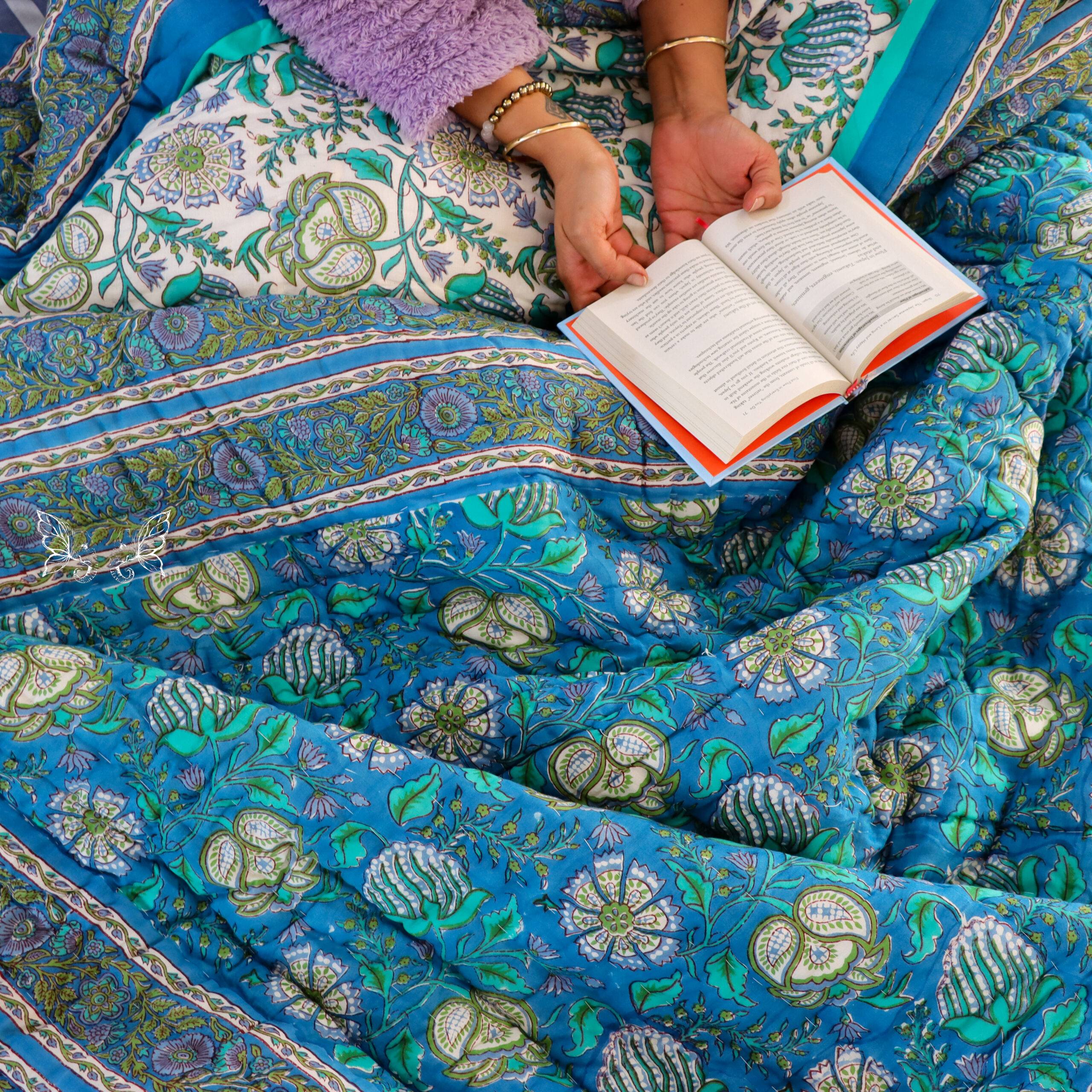 Azul Blue Pure Cotton Hand Block Printed Reversible Quilt King Size