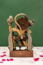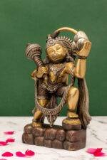 This exquisite brass idol captures Lord Hanuman in unwavering devotion and strength, as he lifts the Sanjeevani Mountain to save Lakshman during the epic battle of the Ramayana. The depiction celebrates Hanuman’s unparalleled dedication to Lord Rama and his determination to overcome any obstacle in the path of righteousness (dharma).