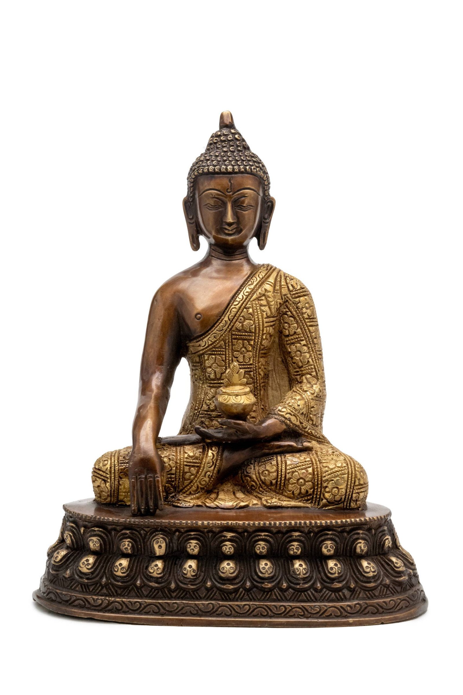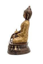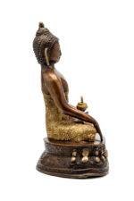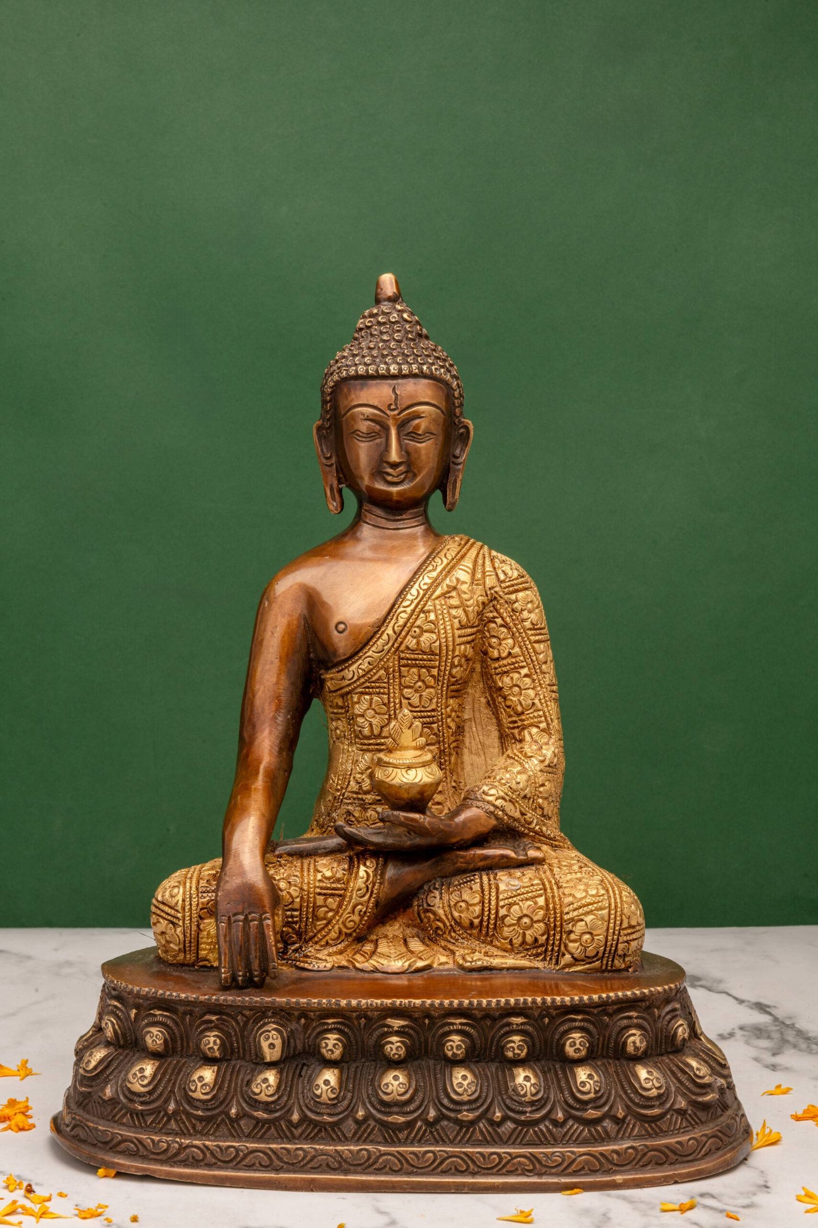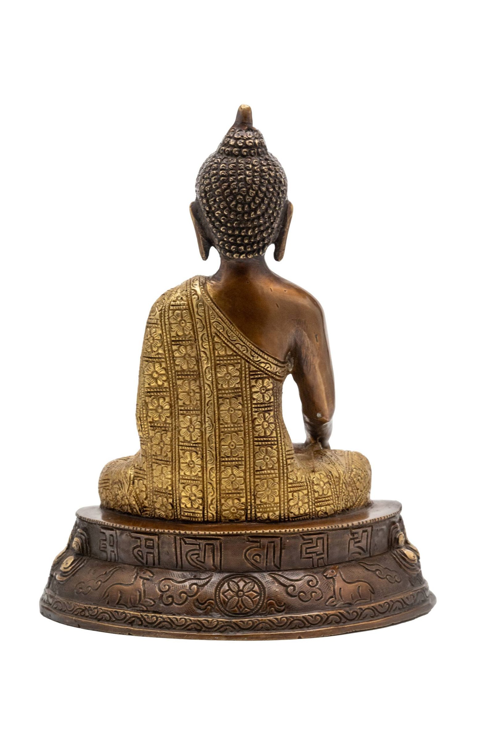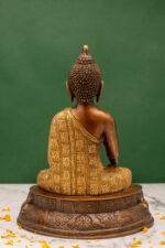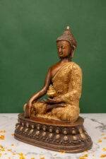 The Brass Buddha Idol in the Bhumisparsha Mudra, also known as the “Earth Touching Gesture,” is a powerful symbol of enlightenment, groundedness, and the triumph of wisdom over ignorance. According to Buddhist mythology, this mudra represents the moment when Siddhartha Gautama, the historical Buddha, called upon the Earth to witness his unwavering determination to attain enlightenment under the Bodhi tree. In this gesture, the Buddha touches the ground with his right hand, signifying his deep connection to the Earth and his call for the Earth to testify to his inner awakening.