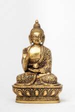 The Abhaya Mudra, also known as the “Gesture of Fearlessness,” is one of the most revered hand gestures in Buddhist iconography. In Buddhism, this mudra symbolizes protection, courage, and the dispelling of fear. The raised right hand, with the palm facing outward, conveys a universal message: “Do not fear.” This gesture is believed to have been made by Buddha after attaining enlightenment to soothe a charging elephant, showcasing his power of compassion over aggression.. This mudra reflects the Buddha’s divine ability to bring calm, confidence, and fearlessness in the face of adversity.