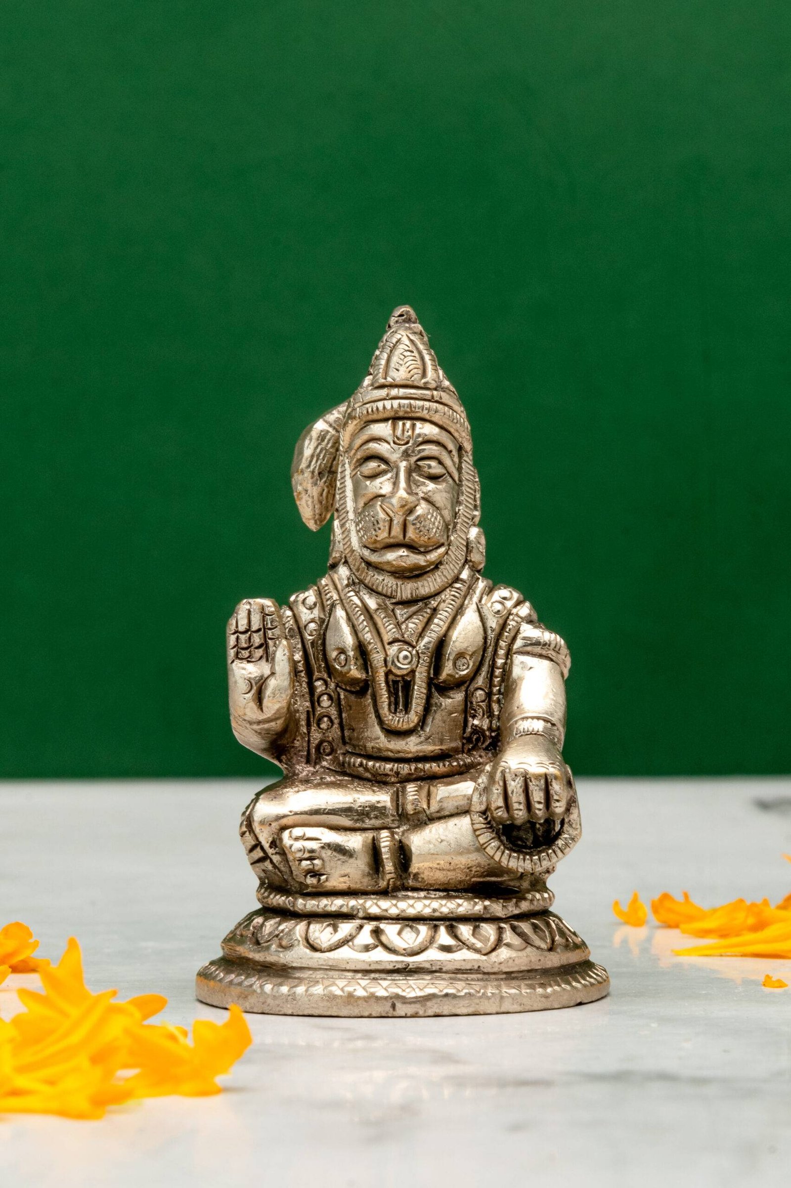 In the Ramayana, Hanuman’s unwavering loyalty to Lord Rama and his fearless determination to overcome obstacles serve as a timeless inspiration. The seated position represents a state of controlled power and mindfulness, where his divine energy is channelized for blessings rather than action, symbolizing inner peace combined with strength.