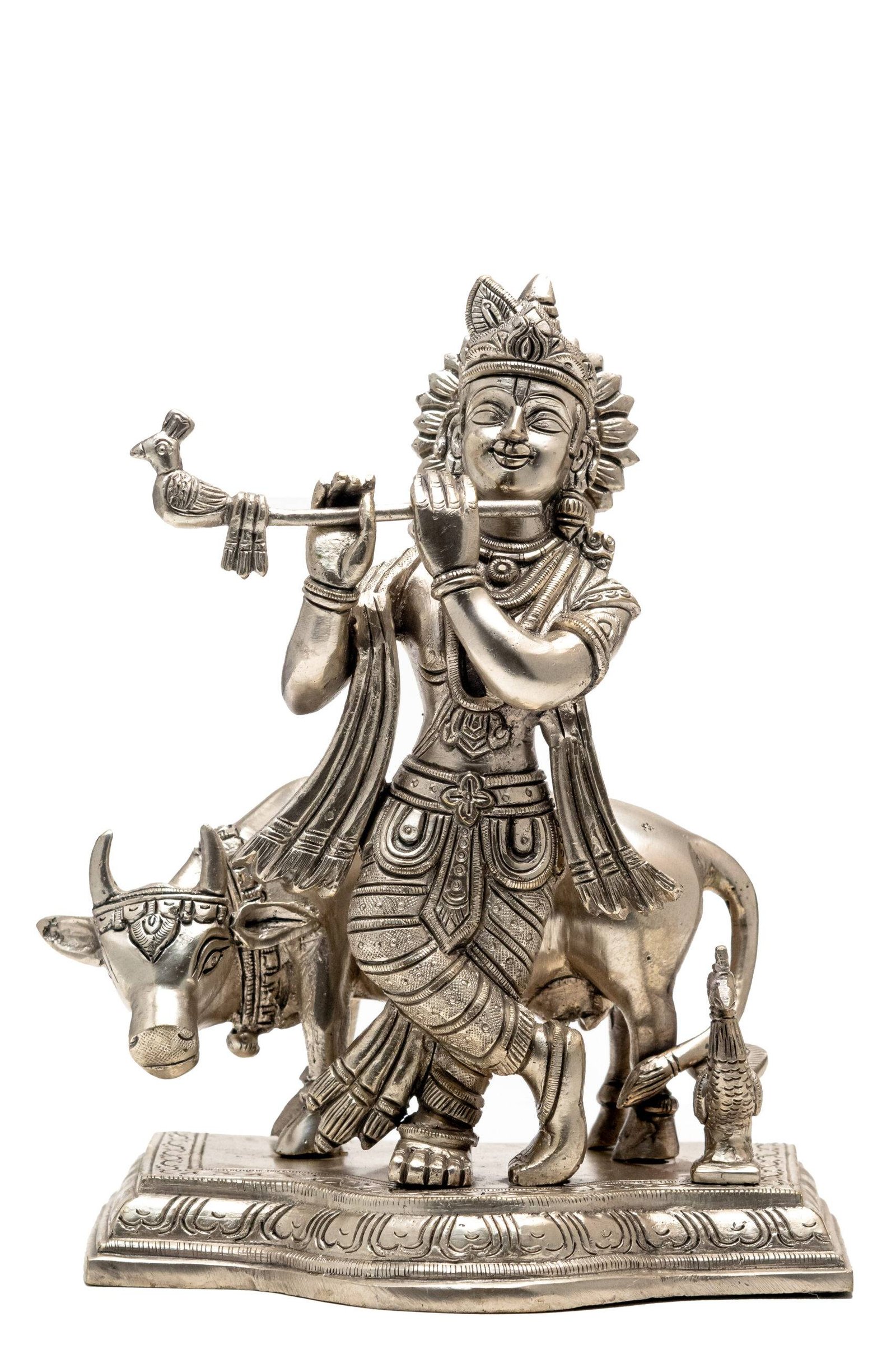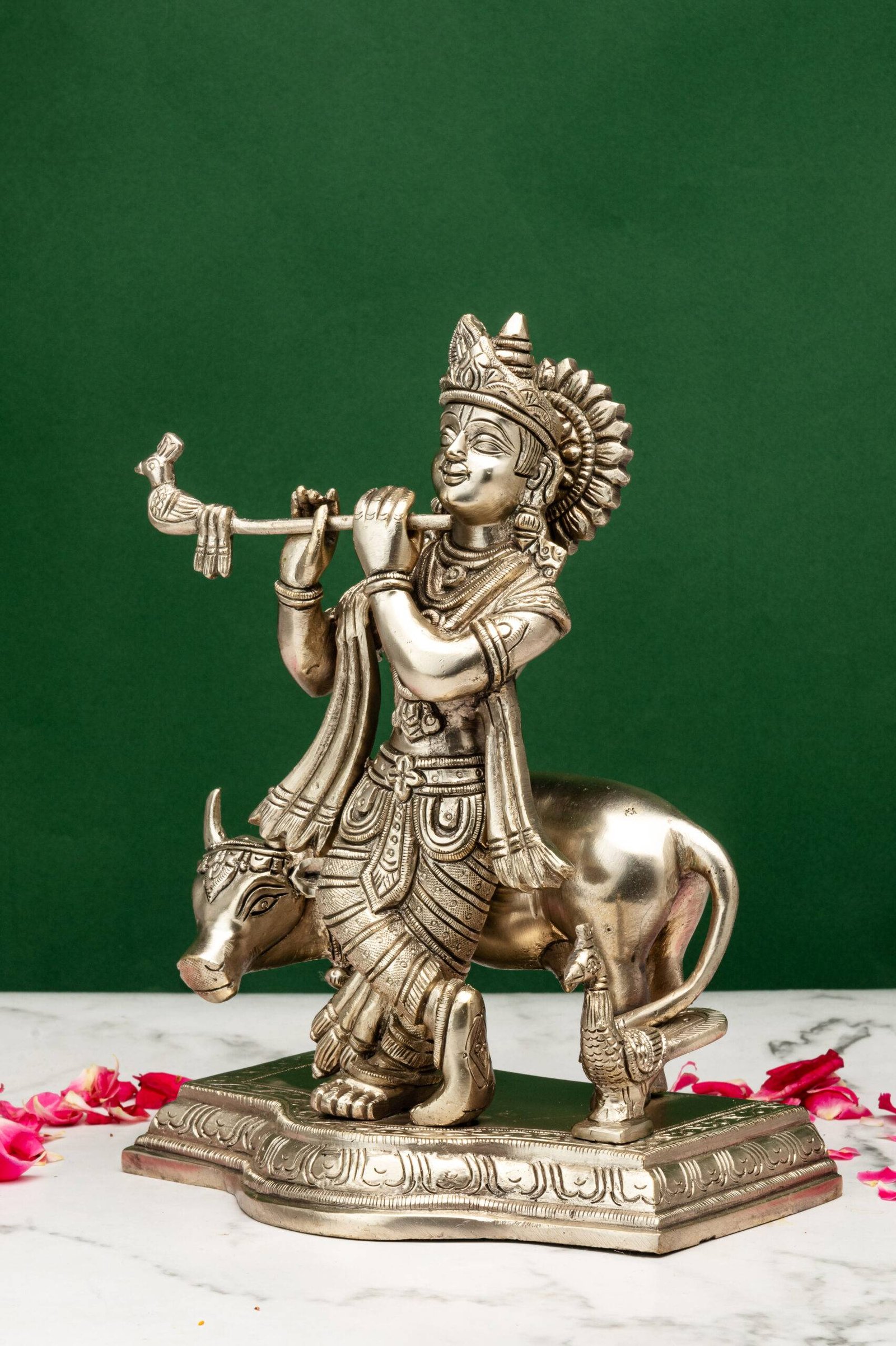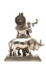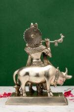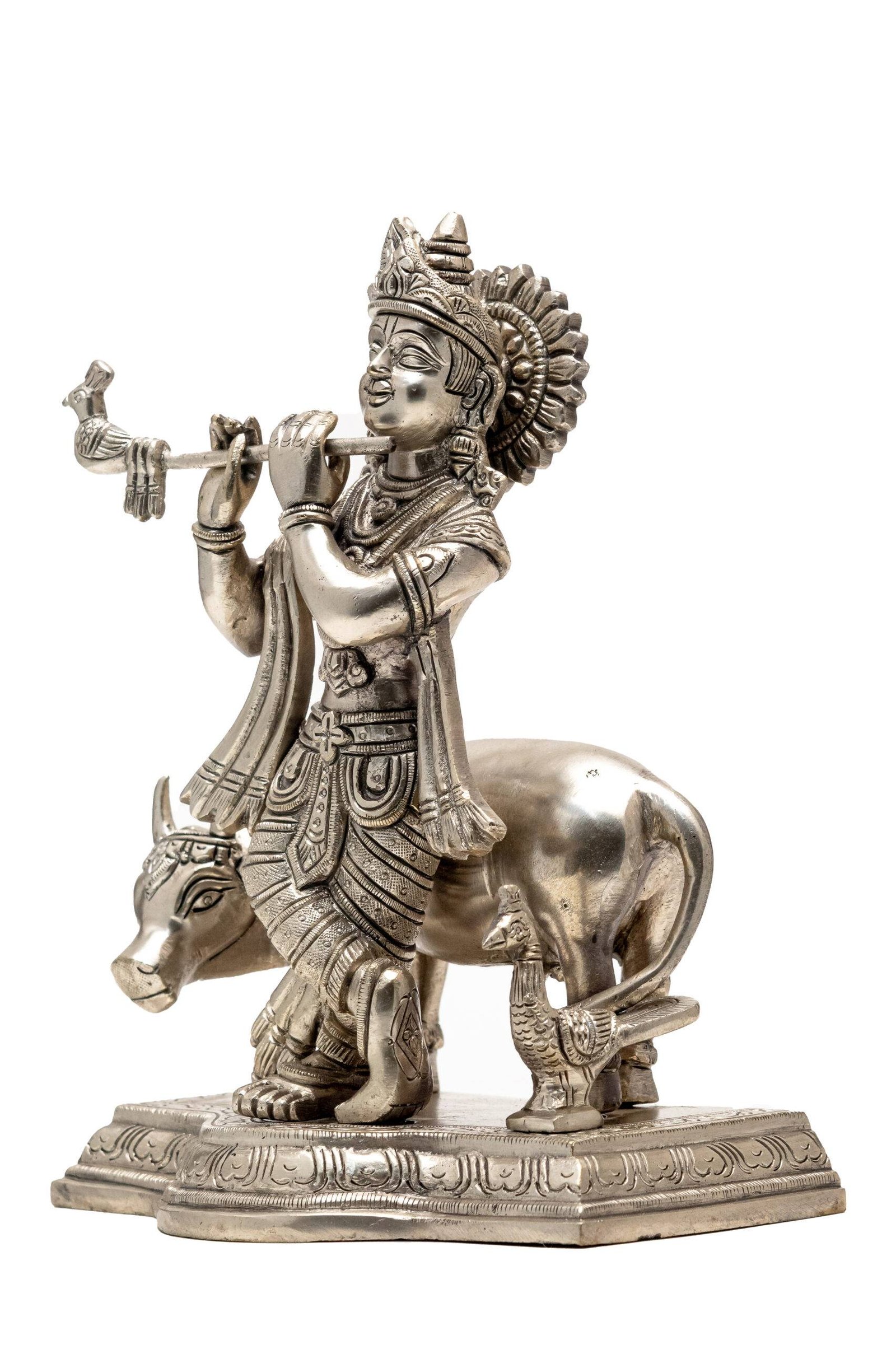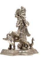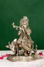 Brass Silver-Coated Superfine Lord Krishna Idol with Cow – 9.5 Inch