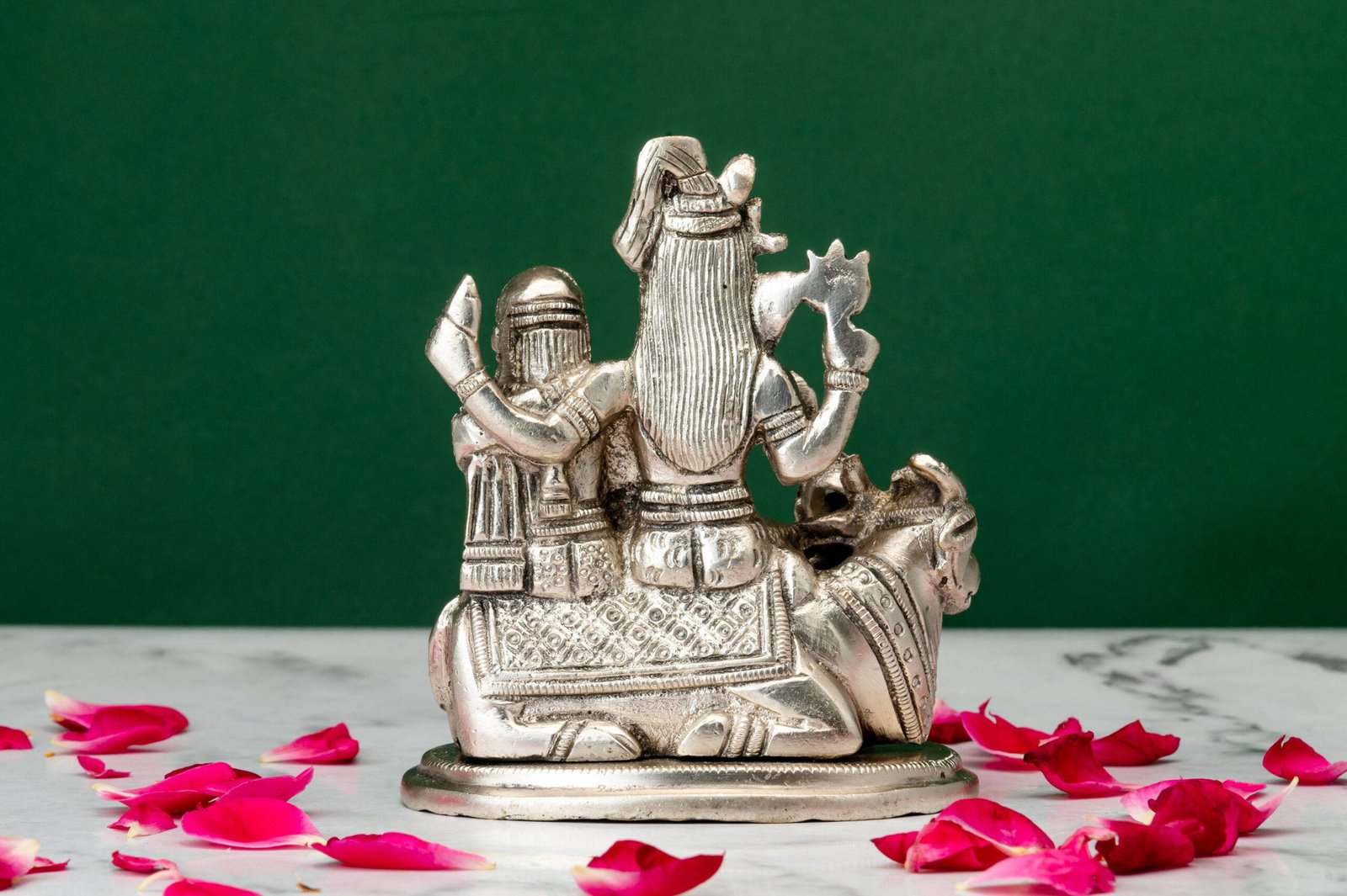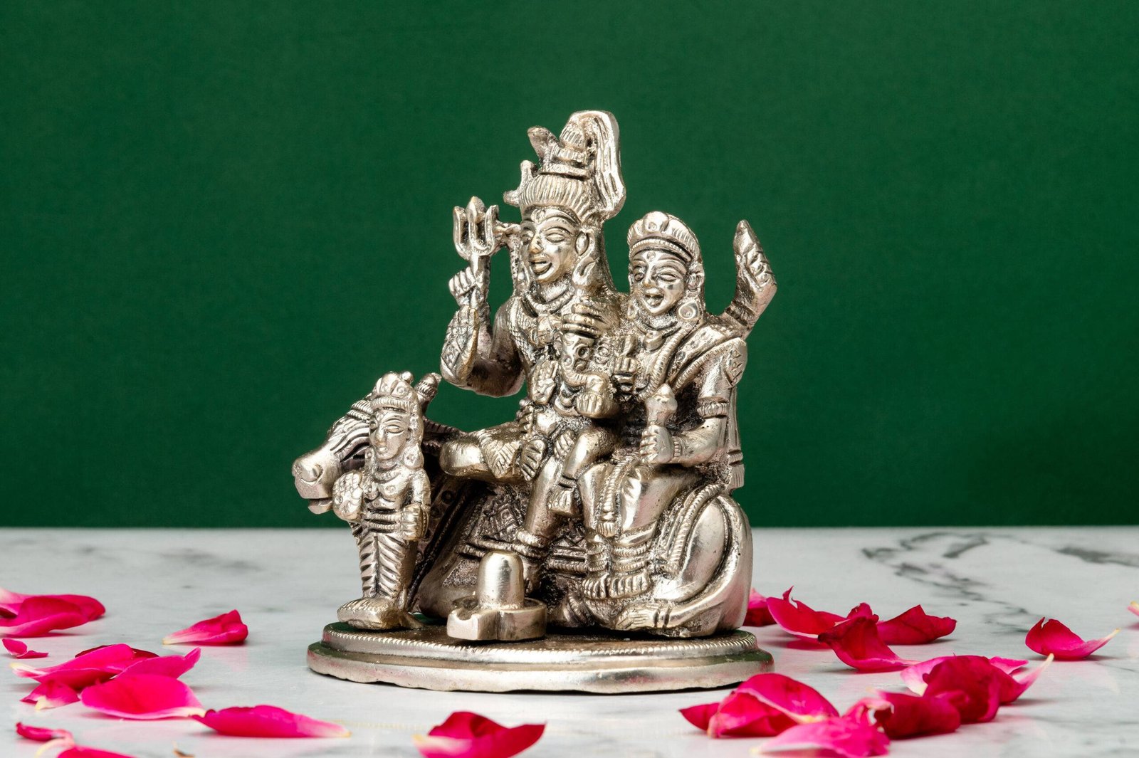 Placing the Brass Silver Coated Shiv Parivar Idol with Ganesh and Kartikeya on Nandi in your space attracts divine blessings, protection, strength, and harmony, fostering an environment of success, spiritual growth, and familial well-being. Ideal for homes and workplaces, this idol invokes peace, courage, and divine guidance in all endeavors.