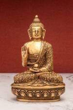 The Abhaya Mudra, also known as the “Gesture of Fearlessness,” is one of the most revered hand gestures in Buddhist iconography. In Buddhism, this mudra symbolizes protection, courage, and the dispelling of fear. The raised right hand, with the palm facing outward, conveys a universal message: “Do not fear.” This gesture is believed to have been made by Buddha after attaining enlightenment to soothe a charging elephant, showcasing his power of compassion over aggression.. This mudra reflects the Buddha’s divine ability to bring calm, confidence, and fearlessness in the face of adversity.