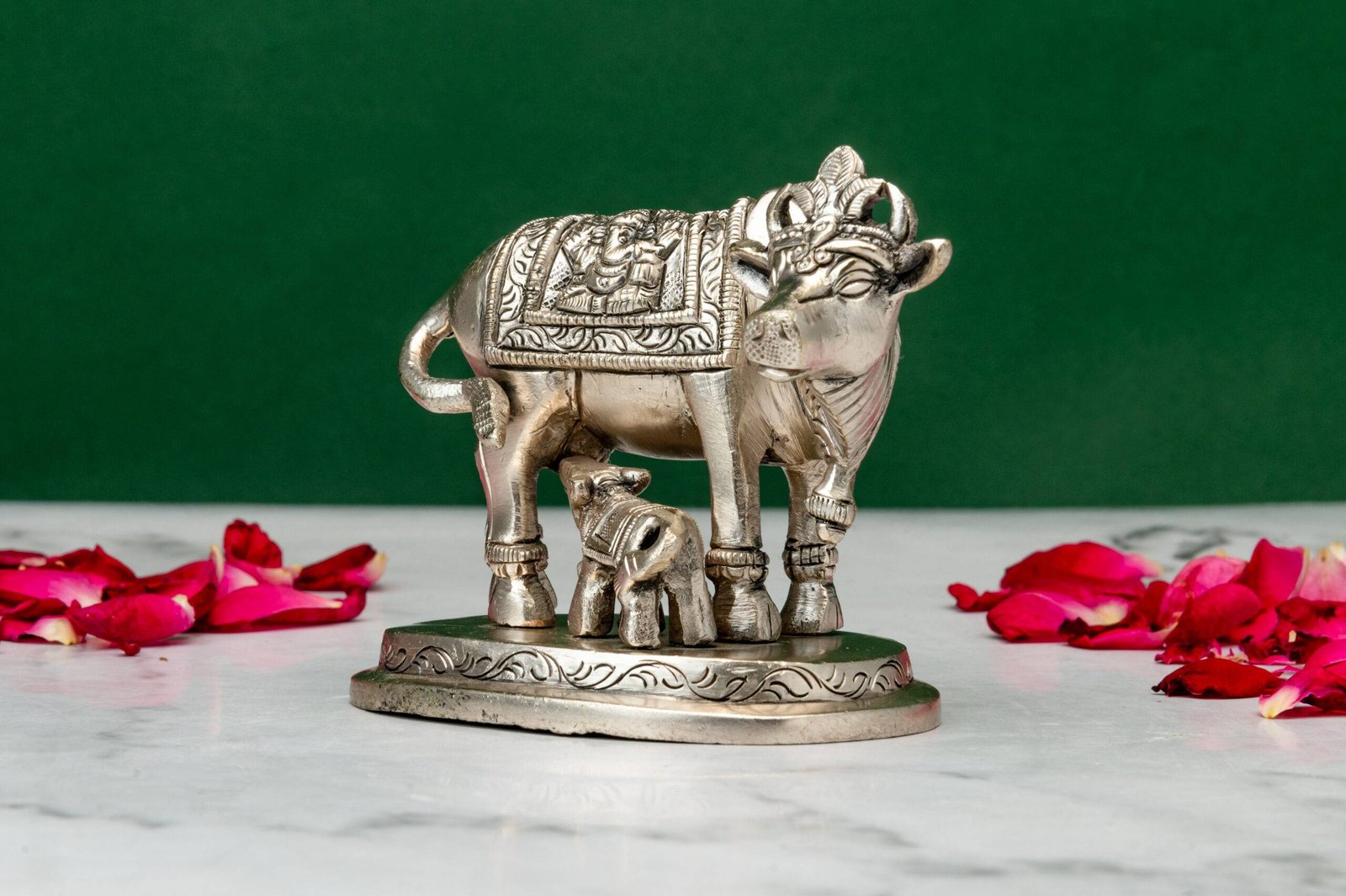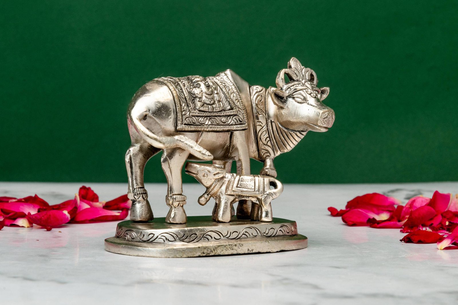 Displaying an idol of the holy cow with a calf in your home serves as a constant reminder of divine abundance, maternal care, and spiritual purity, enriching the environment with positive and nurturing energy.