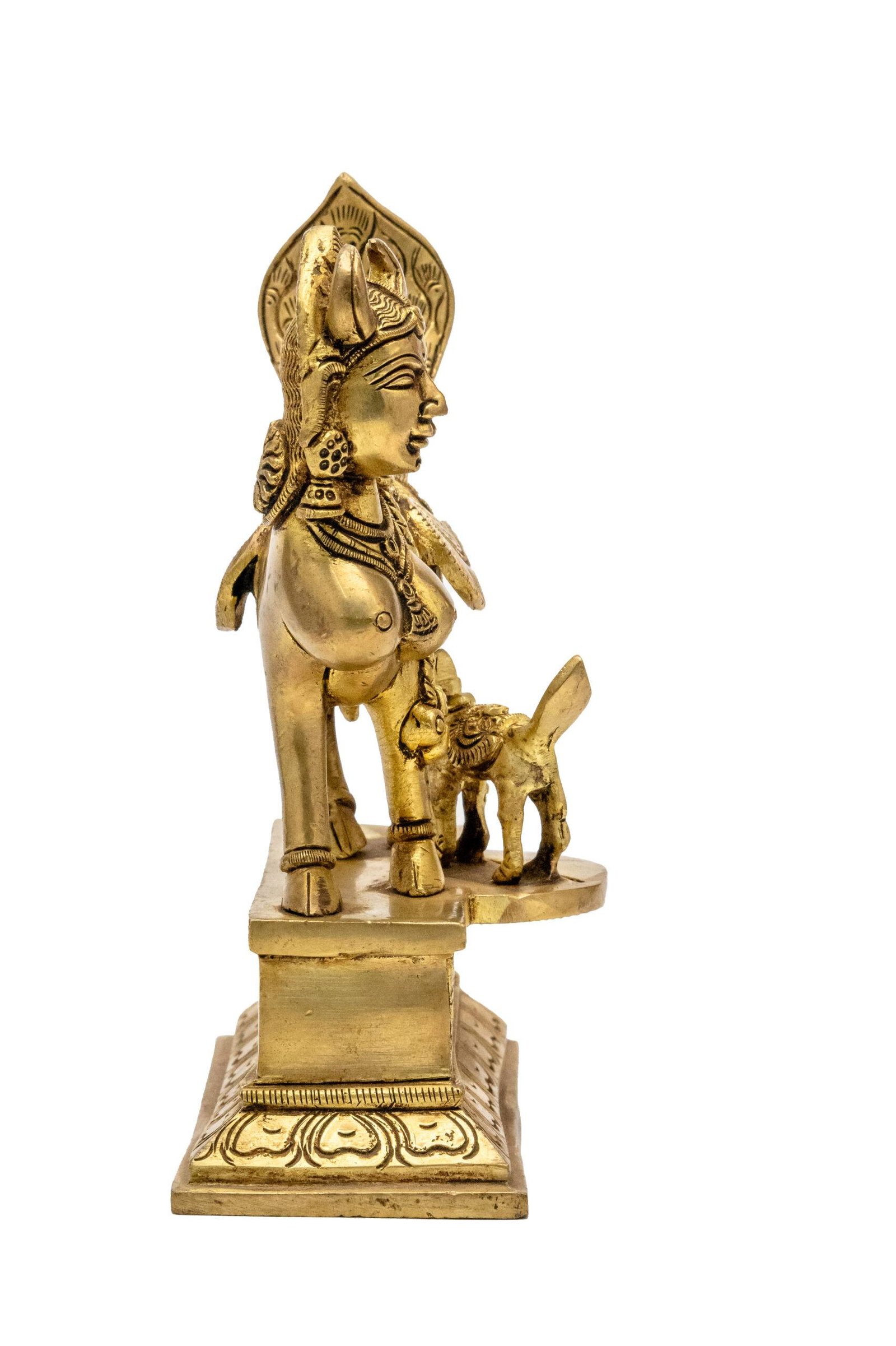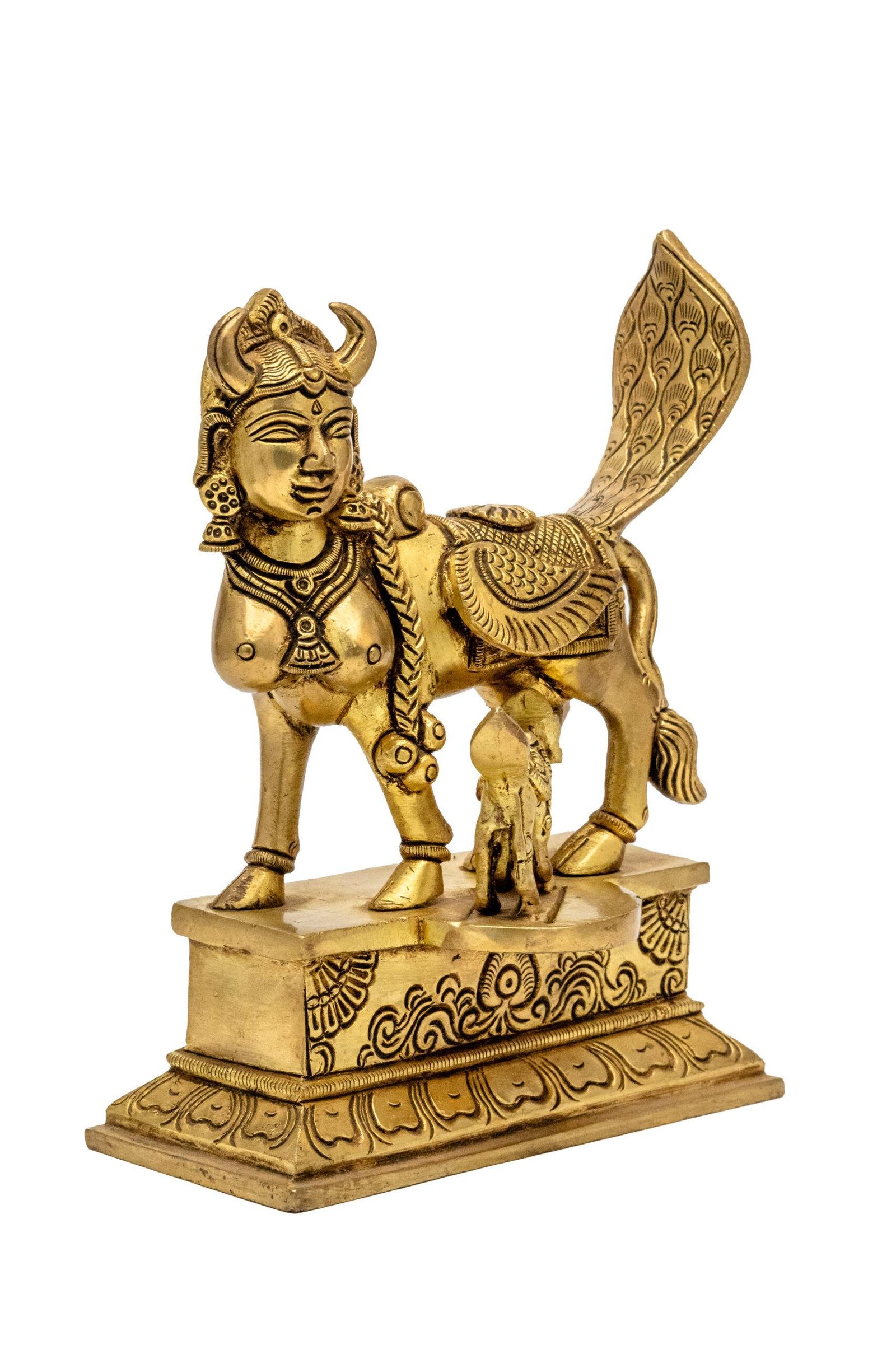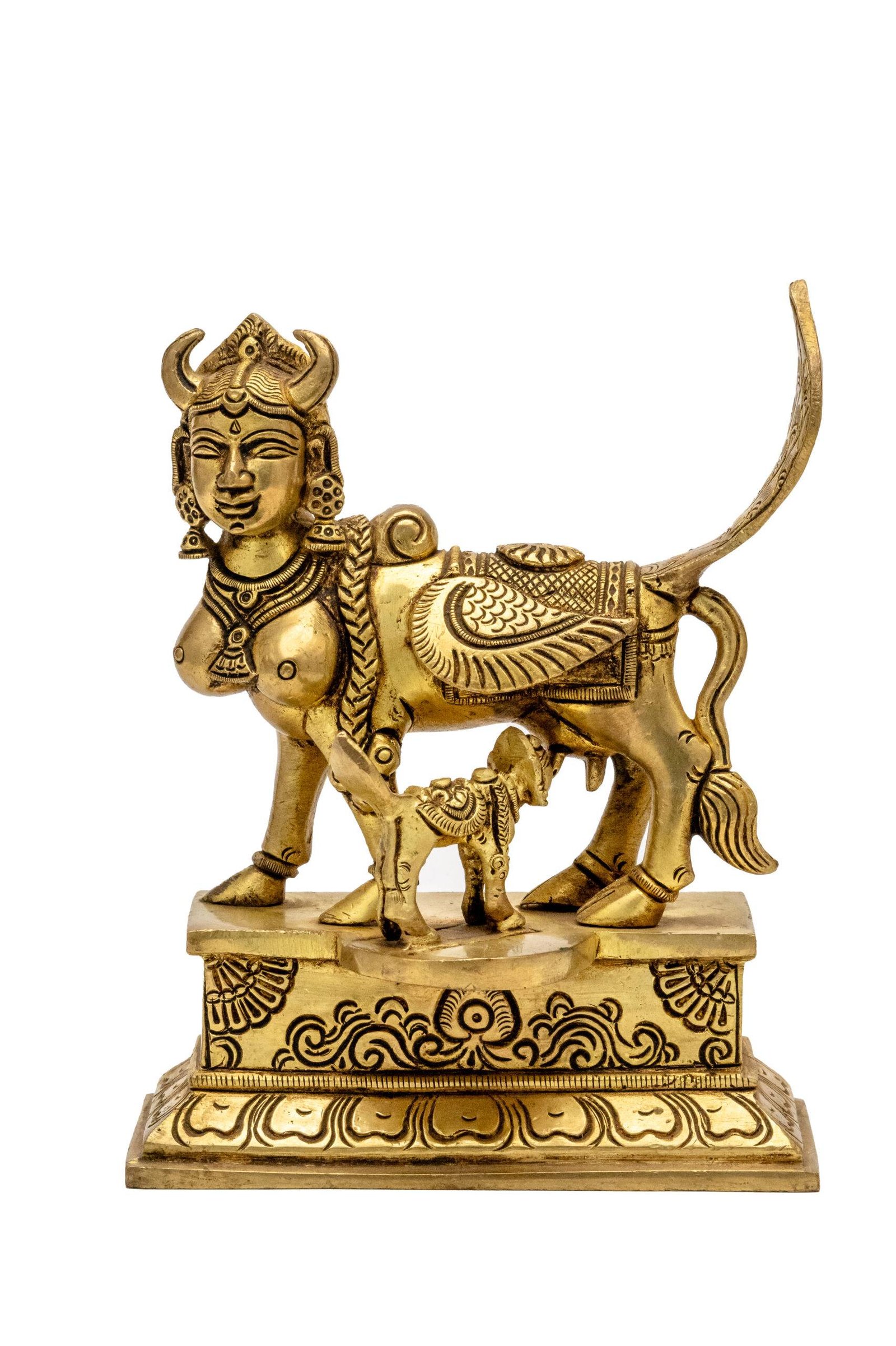 There are various tales about Kamdhenu’s origin. One popular story narrates that she emerged from the churning of the cosmic ocean (Samudra Manthan) alongside other divine treasures. Another story describes her as a creation of Lord Brahma, blessed with the power to grant wishes. The calf accompanying Kamdhenu represents her offspring and symbolizes fertility, abundance, and the continuation of life. The presence of the calf strengthens the symbolism of prosperity extending to future generations.