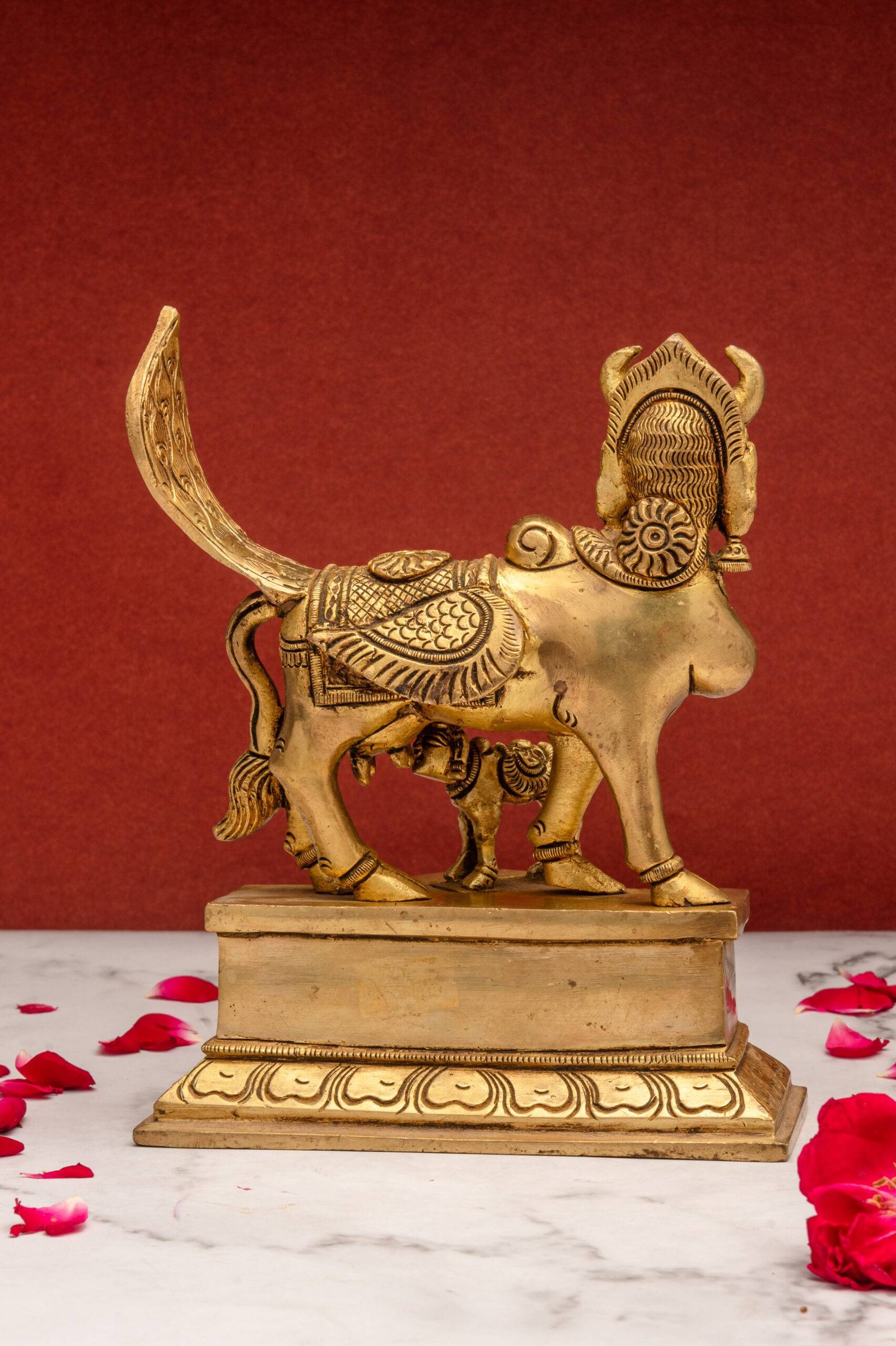 Ideally, place the Kamdhenu cow and calf idol facing east in a clean and elevated space in your home or office. By keeping the idol of Kamdhenu and her calf, you invite the essence of this divine cow into your life, seeking her benevolence and the promise of a prosperous and fulfilling future.