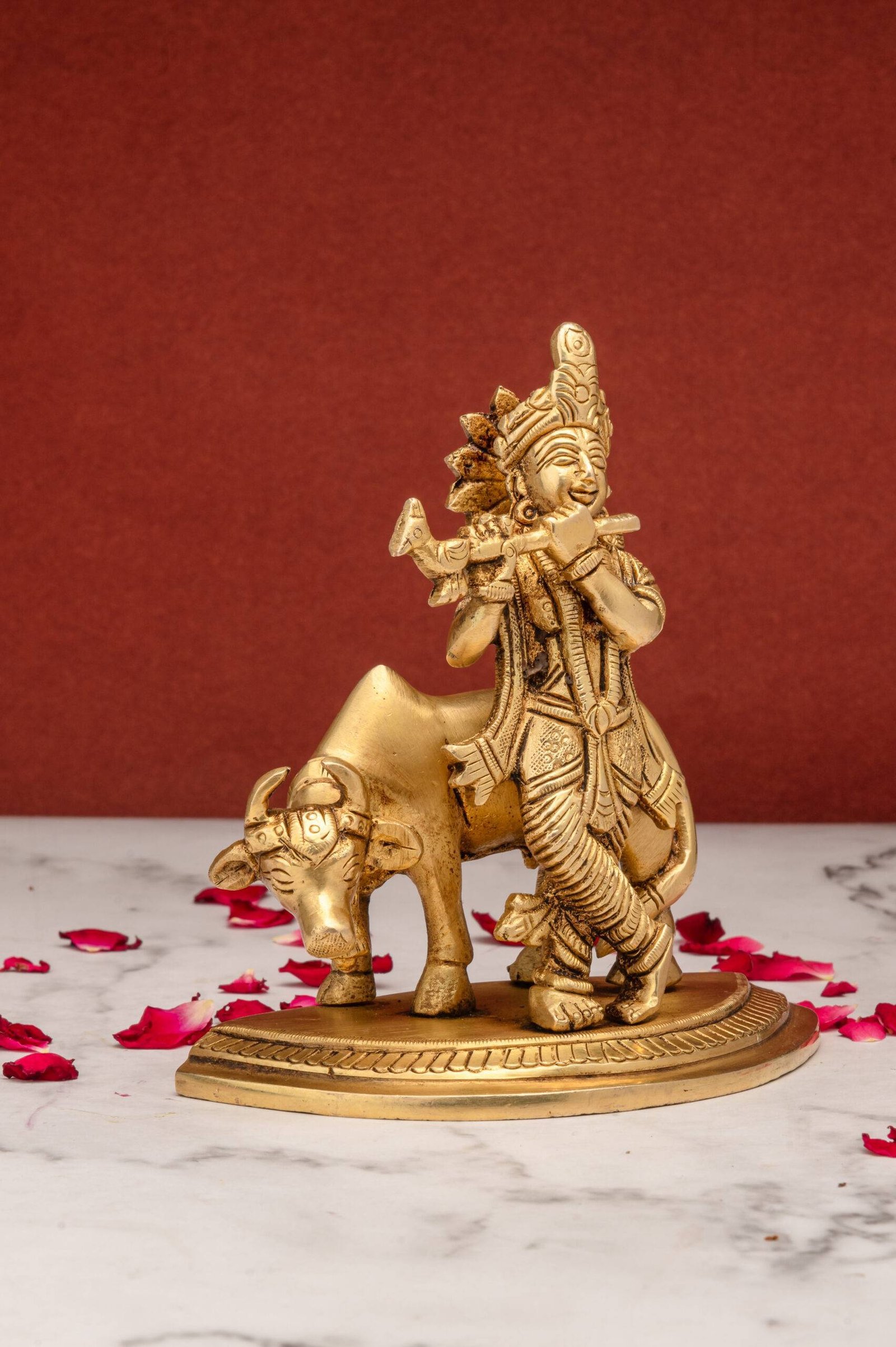 Placing the Brass Superfine Lord Krishna Idol with Cow Playing Flute at your home or office invites divine blessings, spiritual well-being, and a flow of positive energy that inspires peace, prosperity, and joy in all aspects of life.