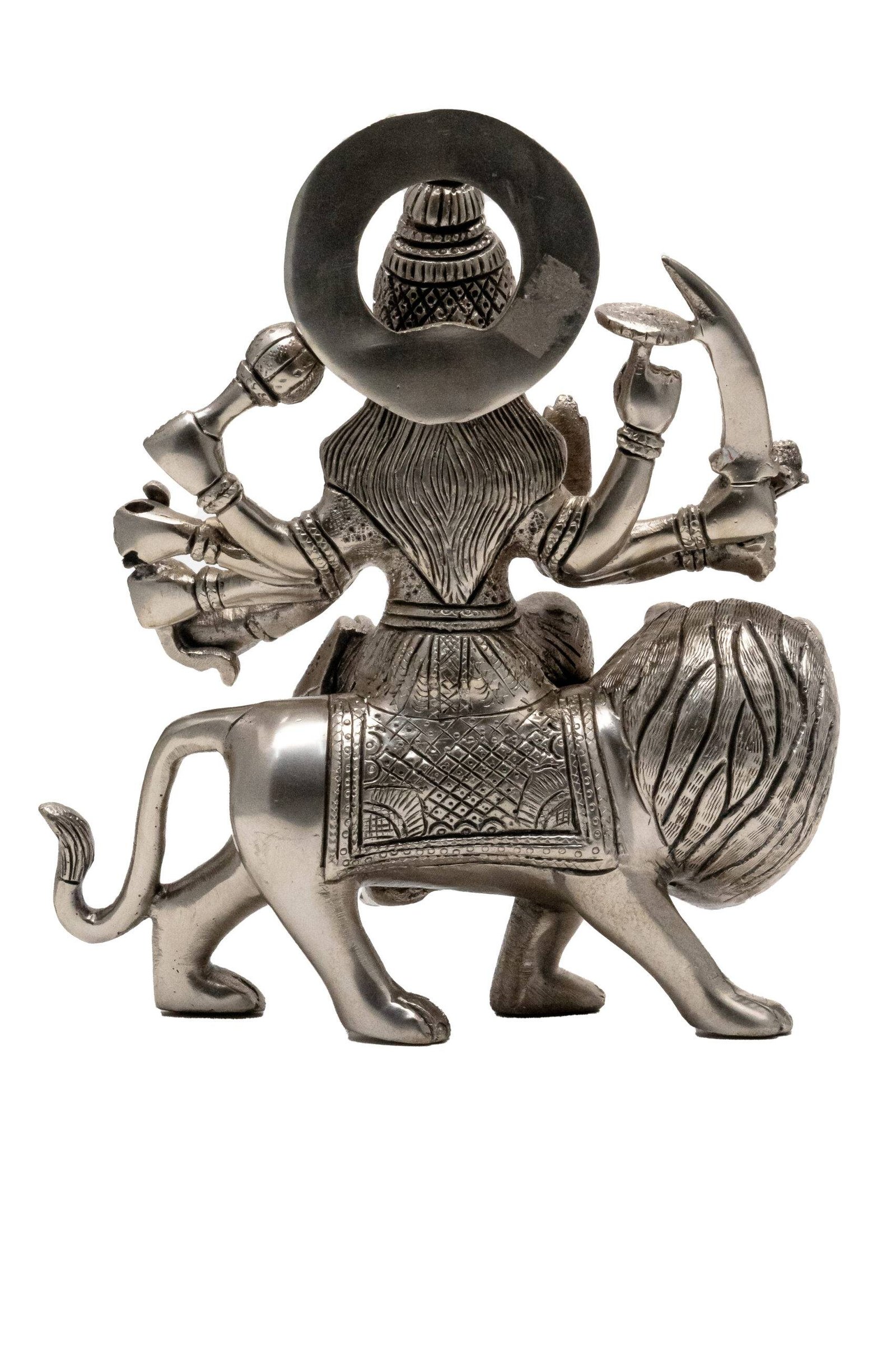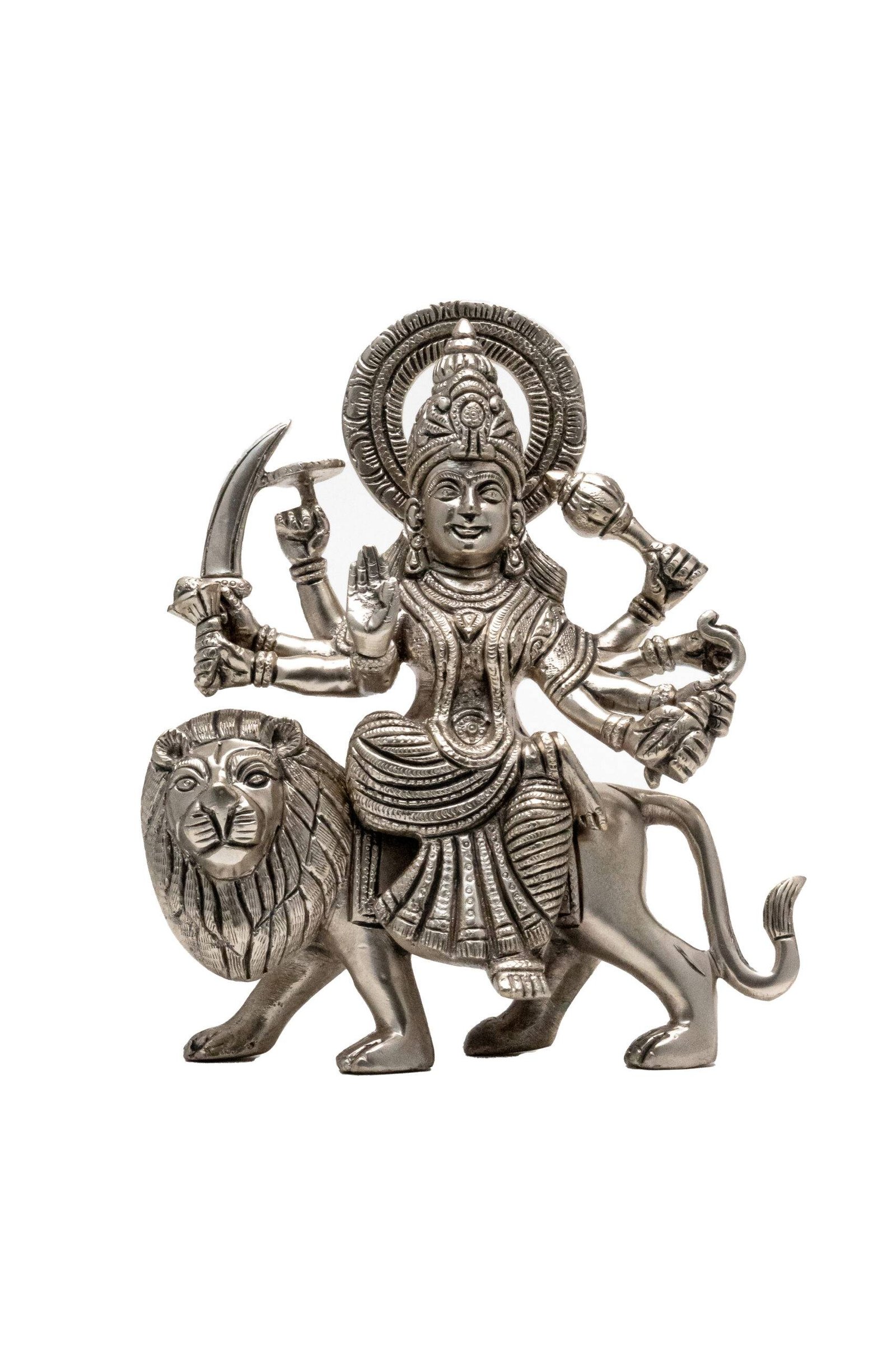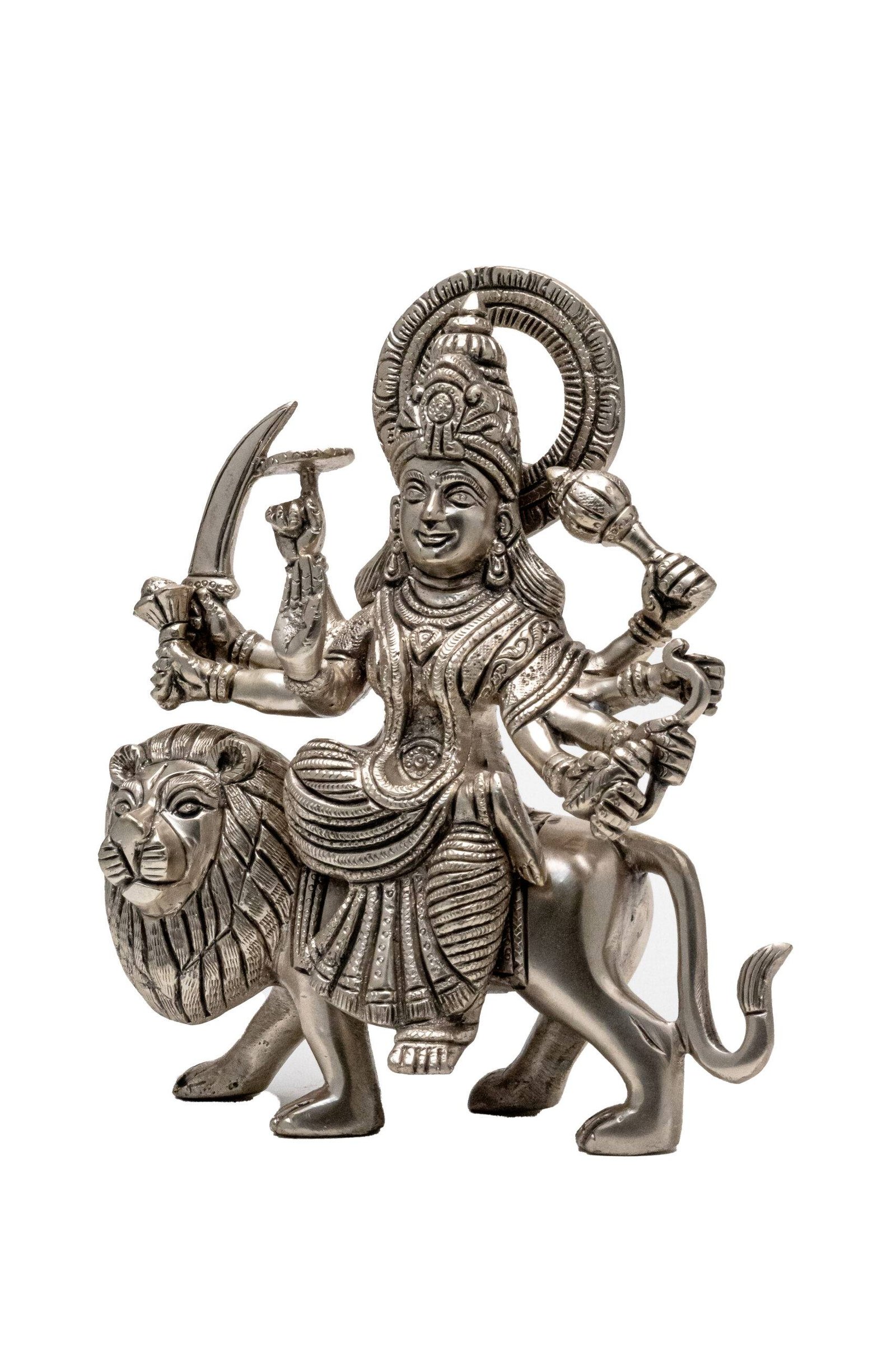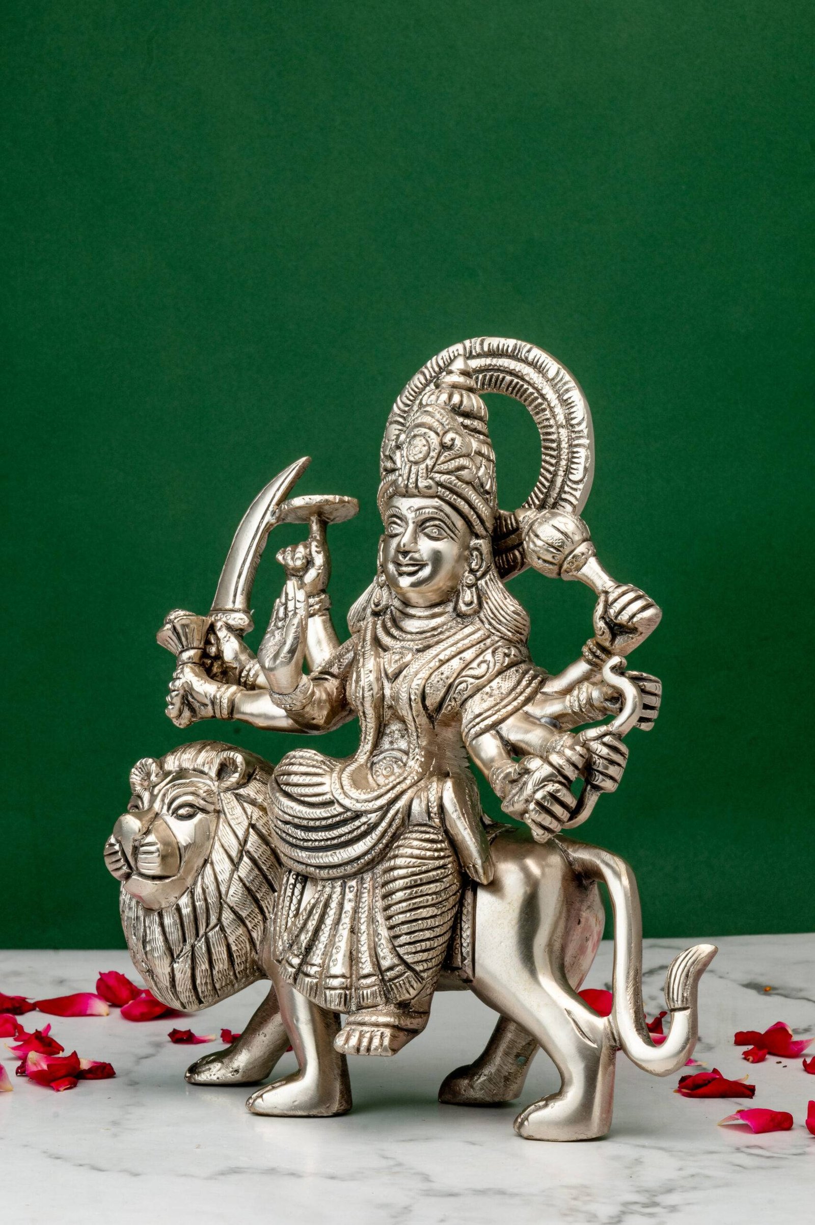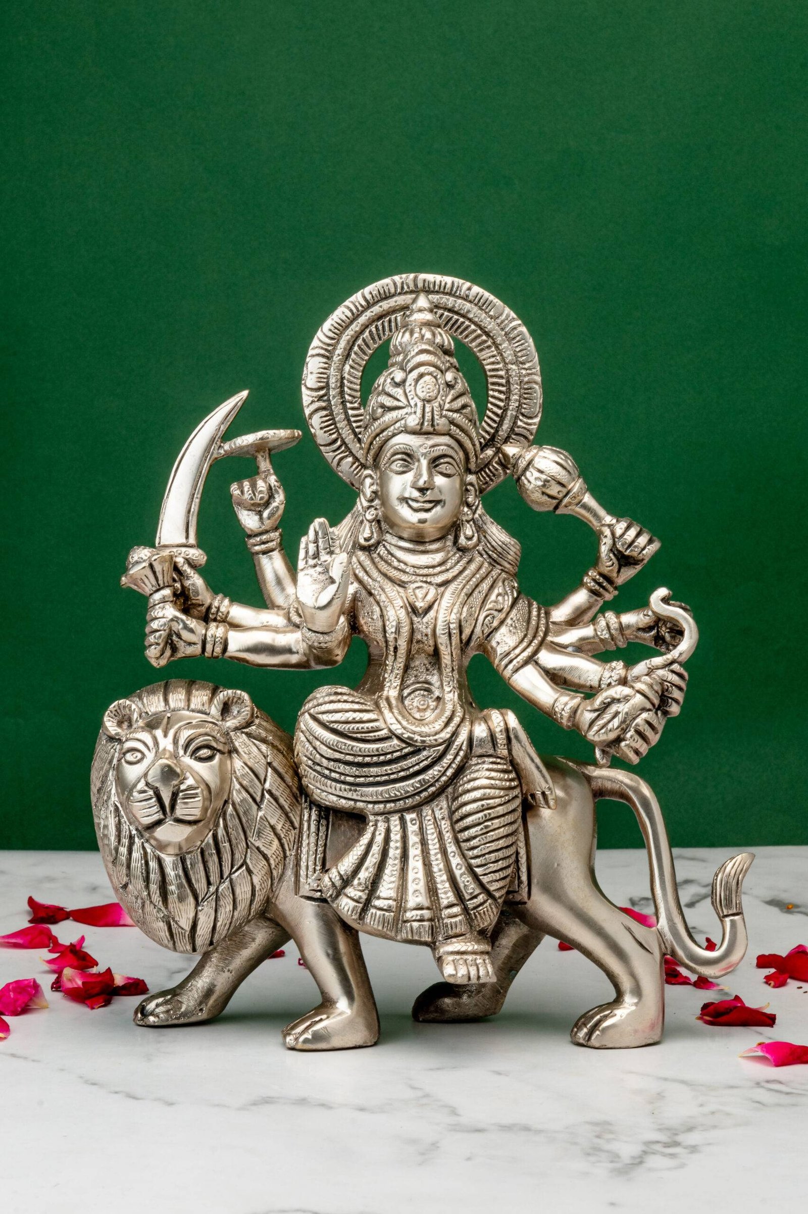 Brass Superfine Ma Durga Idol on Lion – Ashtabhuja – Silver Coated – 8.5 Inch