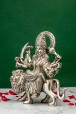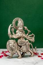 Invite divine strength and protection with our Brass Superfine Ma Durga Idol on Lion – Ashtabhuja – Silver Coated. Meticulously handcrafted from premium brass, this majestic sculpture features Maa Durga with eight powerful arms, riding a fierce lion. Adorned with intricate detailing, it brings blessings of courage, victory, and spiritual power to your home.