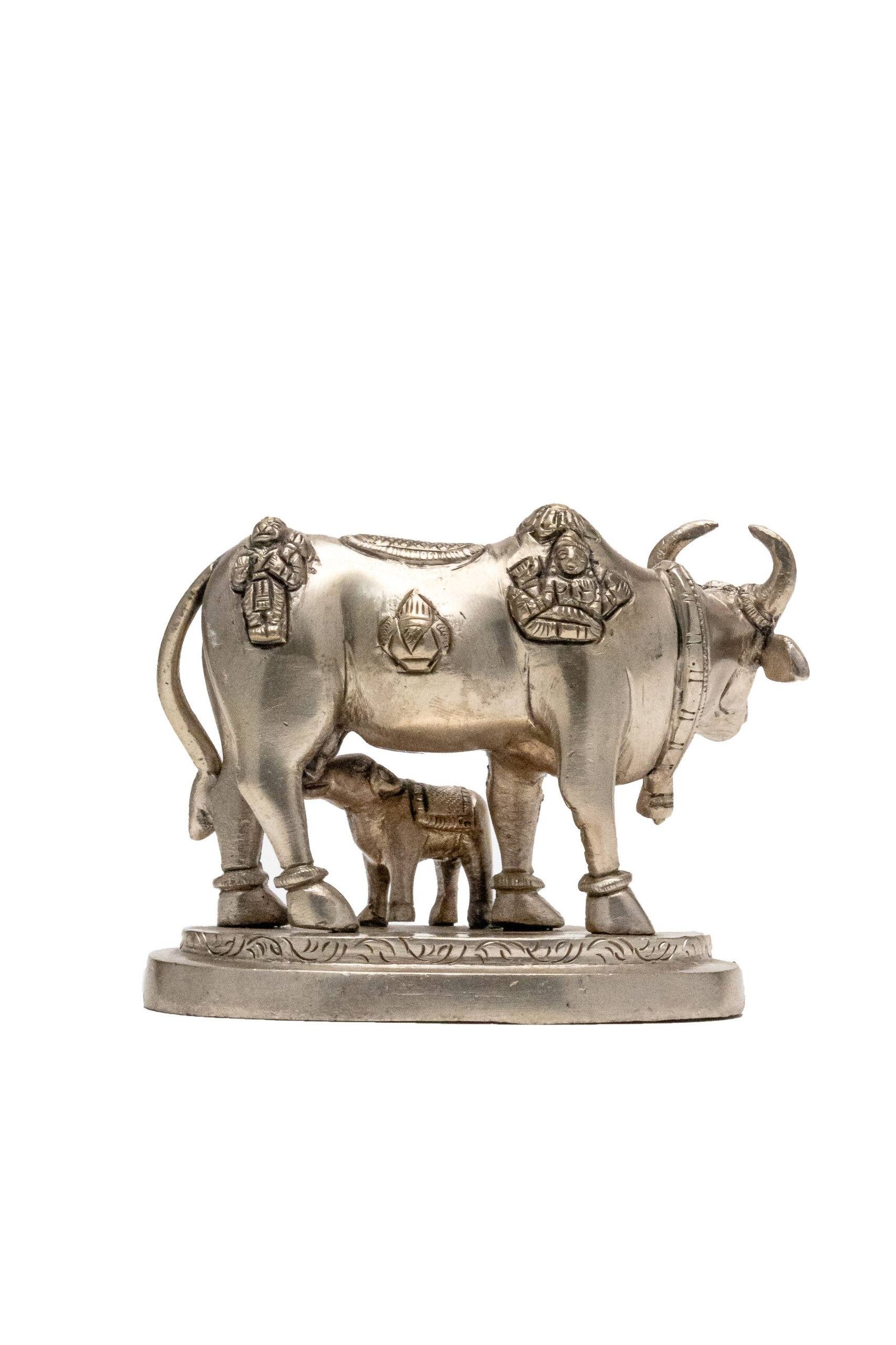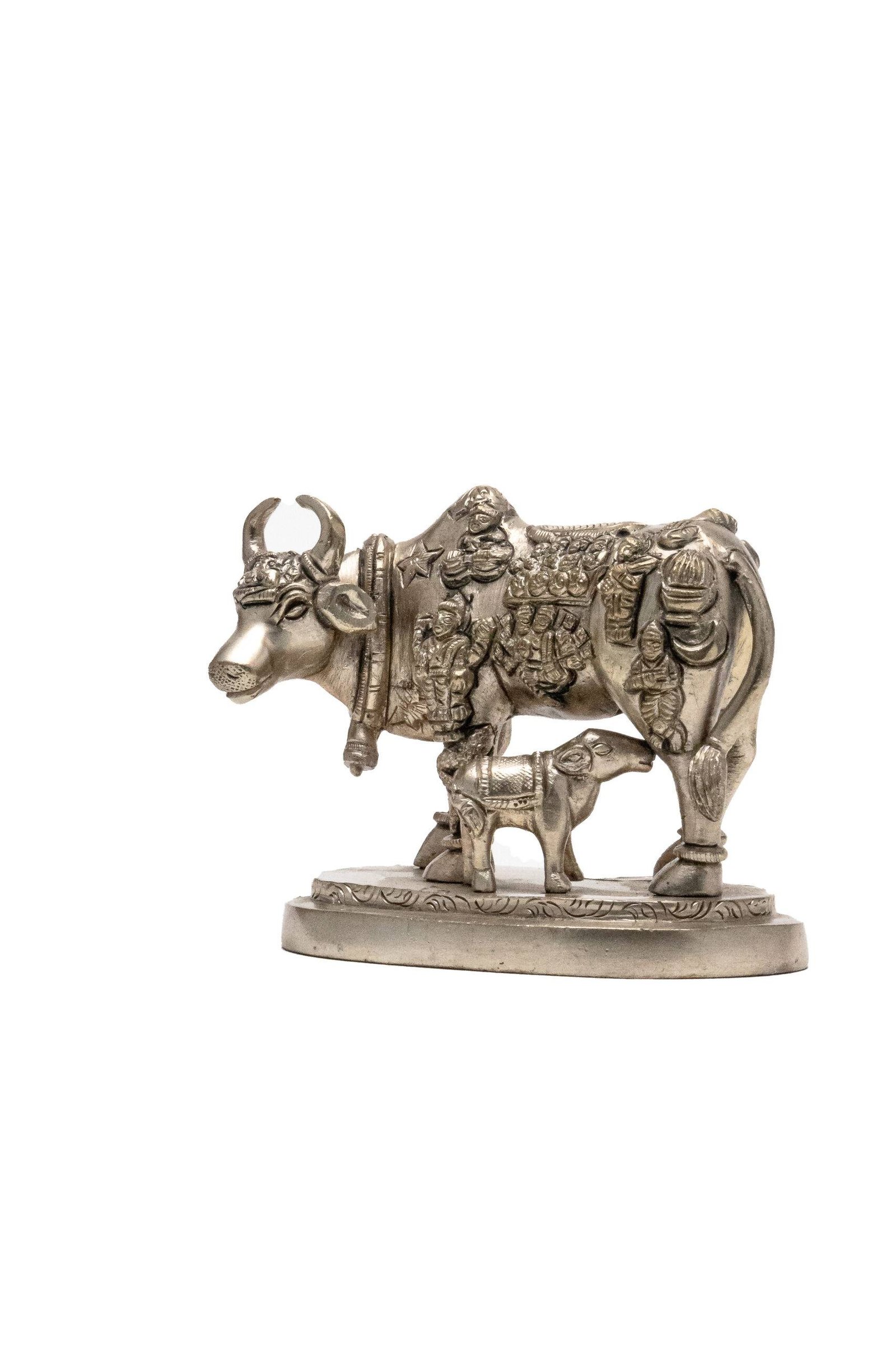 Displaying an idol of the holy cow with a calf in your home serves as a constant reminder of divine abundance, maternal care, and spiritual purity, enriching the environment with positive and nurturing energy.