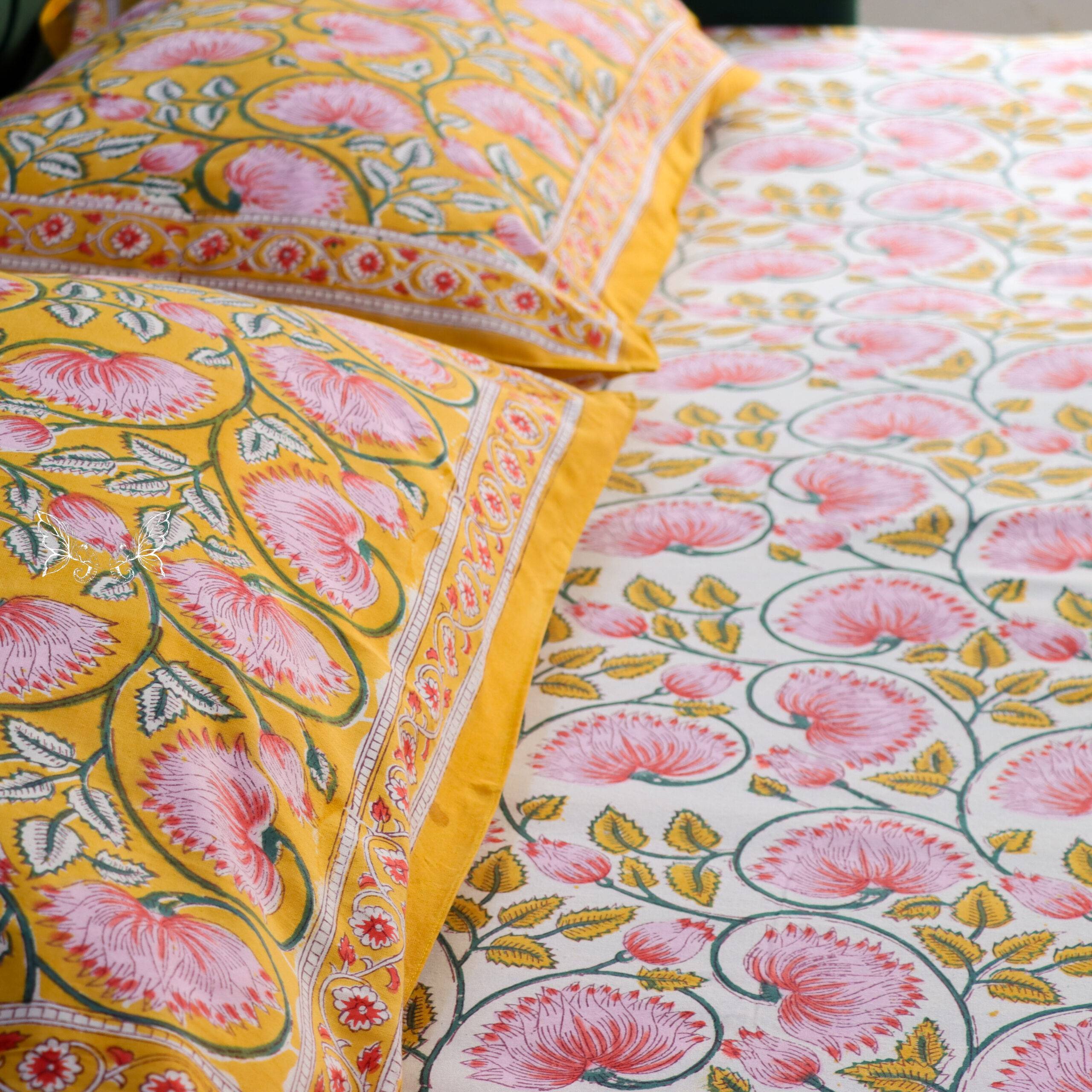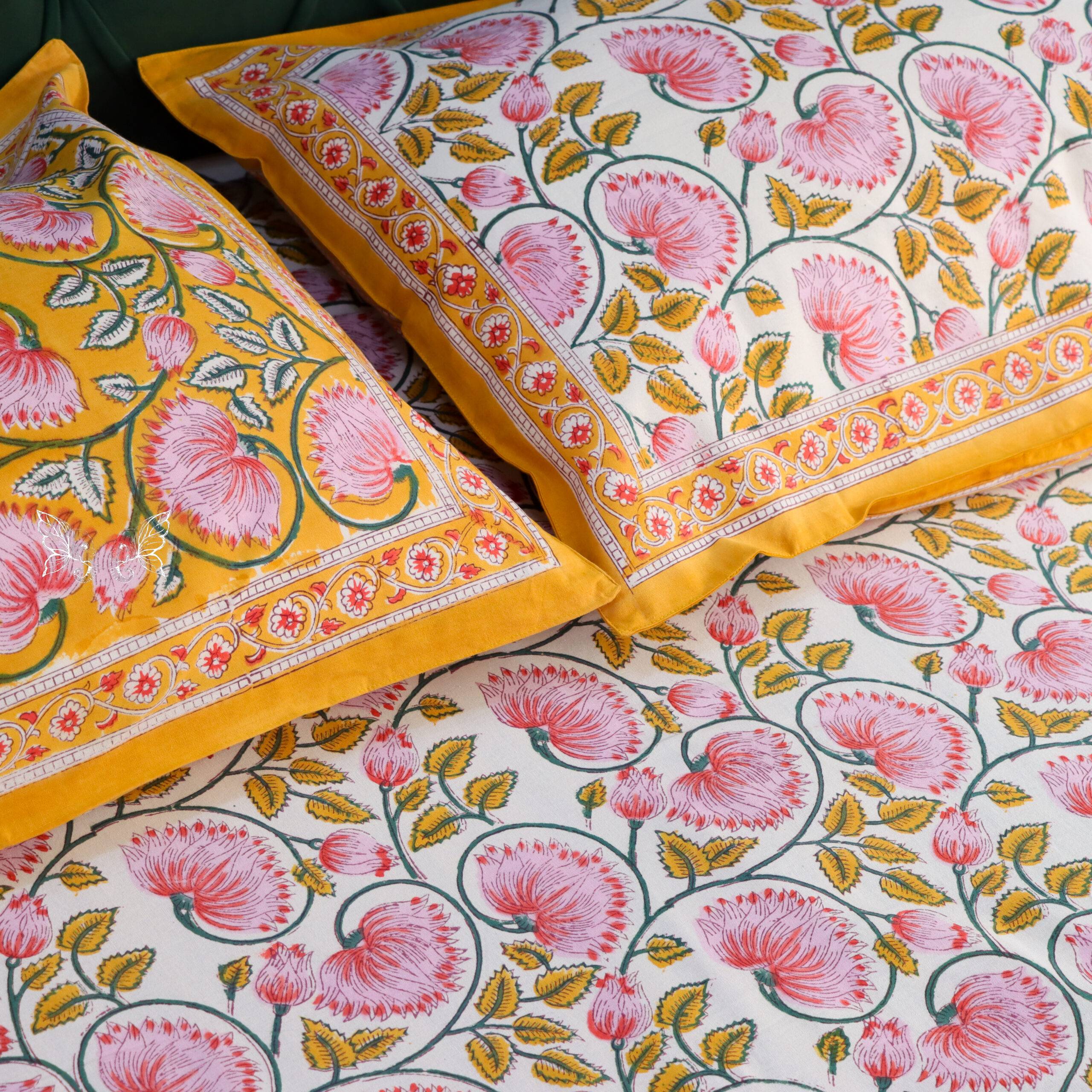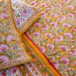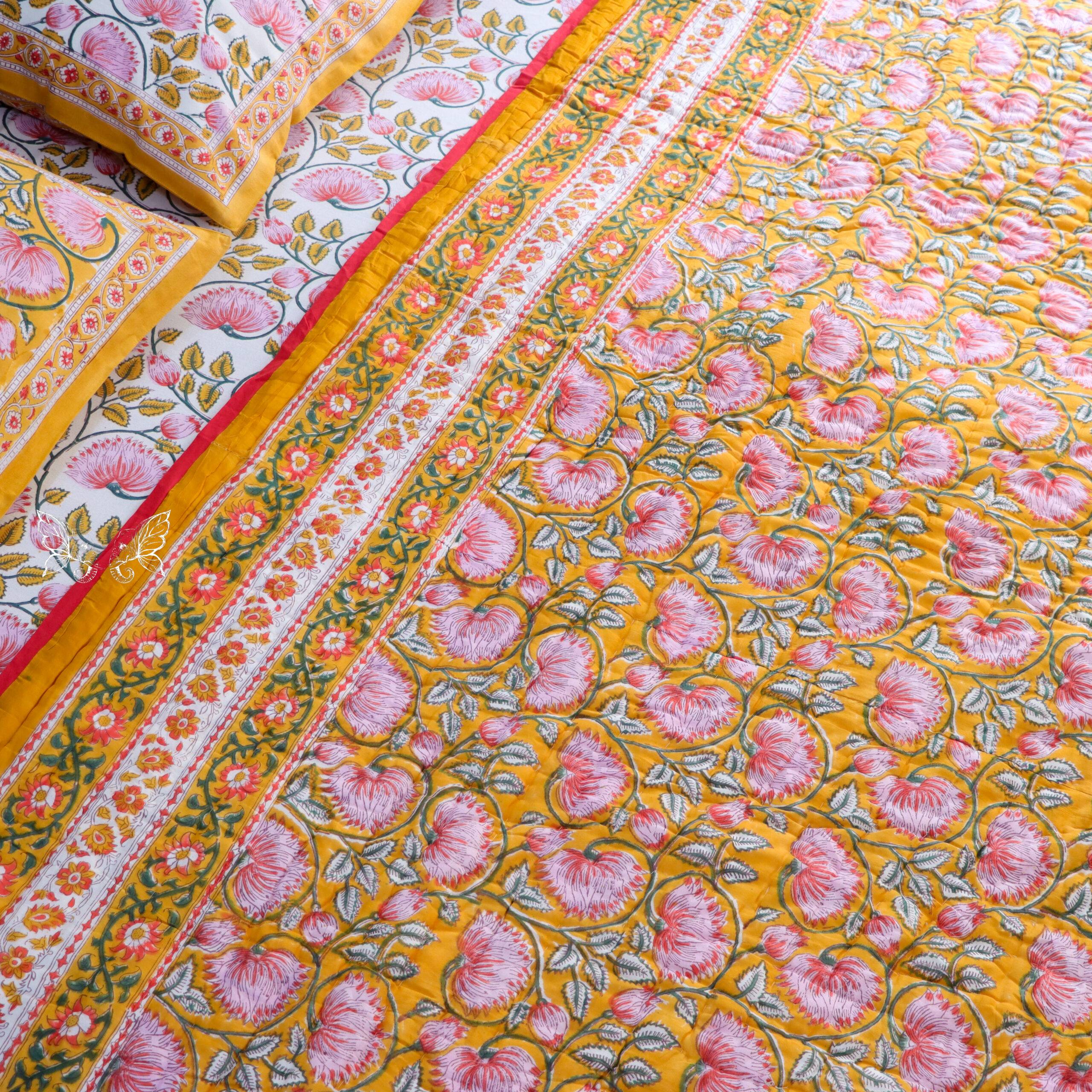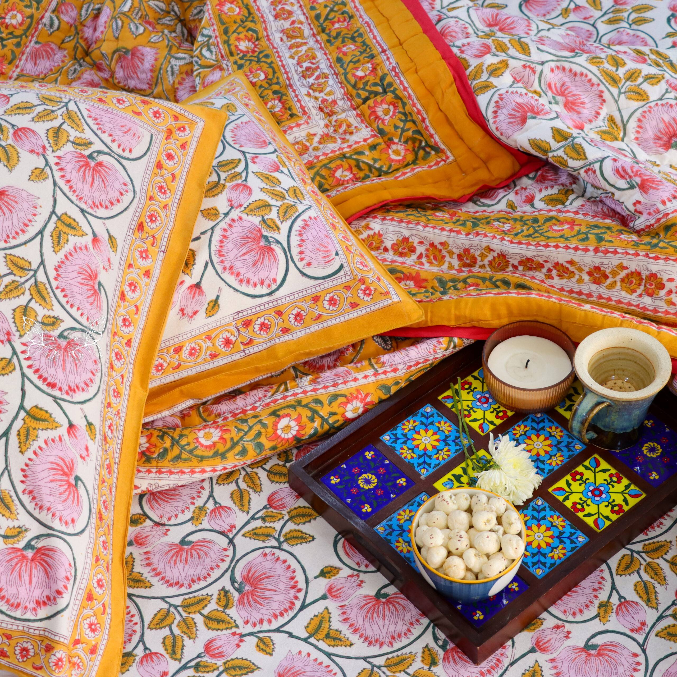 Marigold Bloom Reversible Hand-Block Printed Quilt – Set of 4