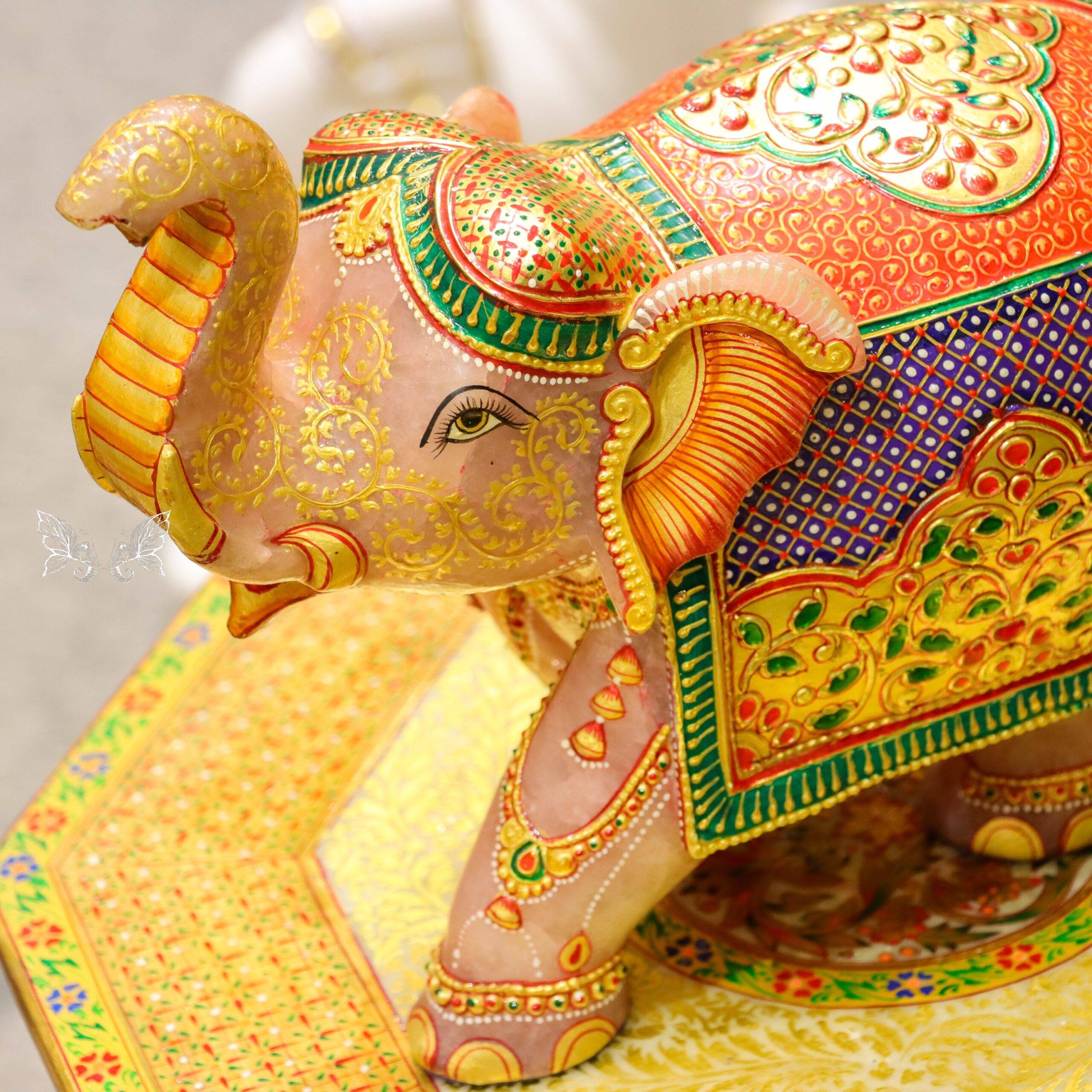 Handcrafted Rose Quartz Elephant with Intricate Hand-Painted Gold Work