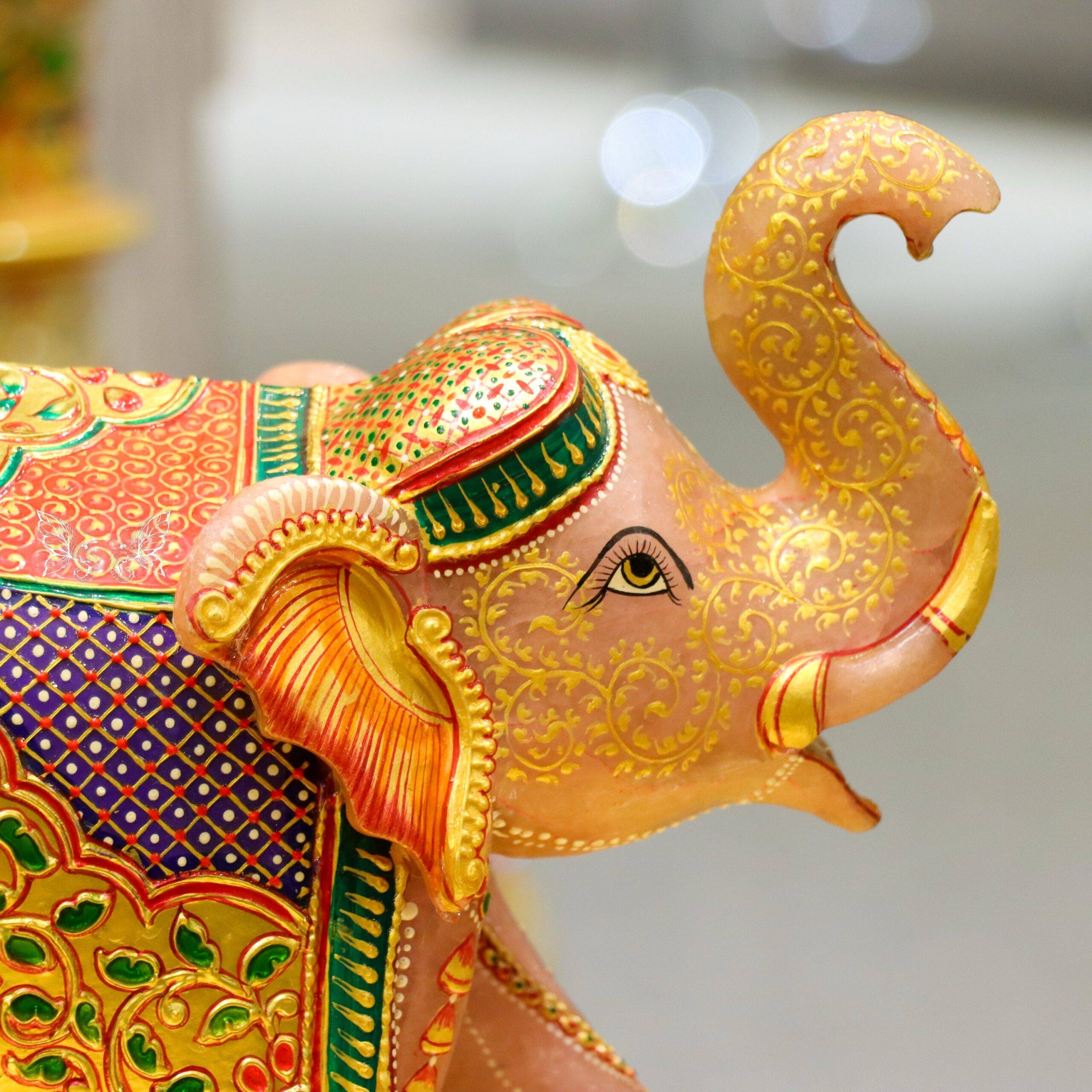 Each piece showcases vibrant traditional patterns in rich hues of red, green, and blue, highlighted with elegant gold accents that enhance the soft, translucent pink tone of rose quartz. The fine detailing on the ears, trunk, and ornamental saddle reflects the skill of master artisans, making every sculpture truly one of a kind.